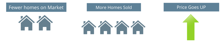 Real estate is sometimes viewed as a commodity like gold or stocks. When buying gold, stocks, or real estate, the buyer’s perception of value determines the timing and price paid. It’s the law of supply and demand. When fewer properties are available, inventory shortage creates buyer competition, causing prices to increase. This gives sellers the advantage and is called a “Sellers Market.”